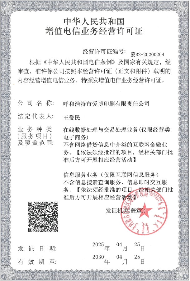 增值电信许可证 蒙B2-20200204